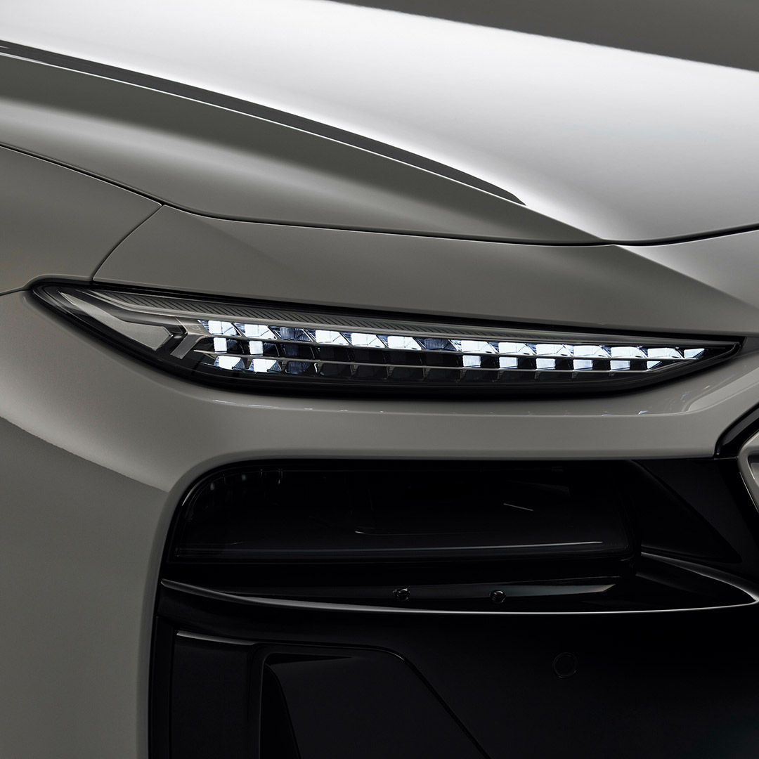 Los faros principales y otros elementos funcionales, como los sensores del Sistema Avanzado de Asistencia al Conductor (ADAS) y las tomas de aire, están integrados en la máscara oscura, haciéndolos casi invisibles.