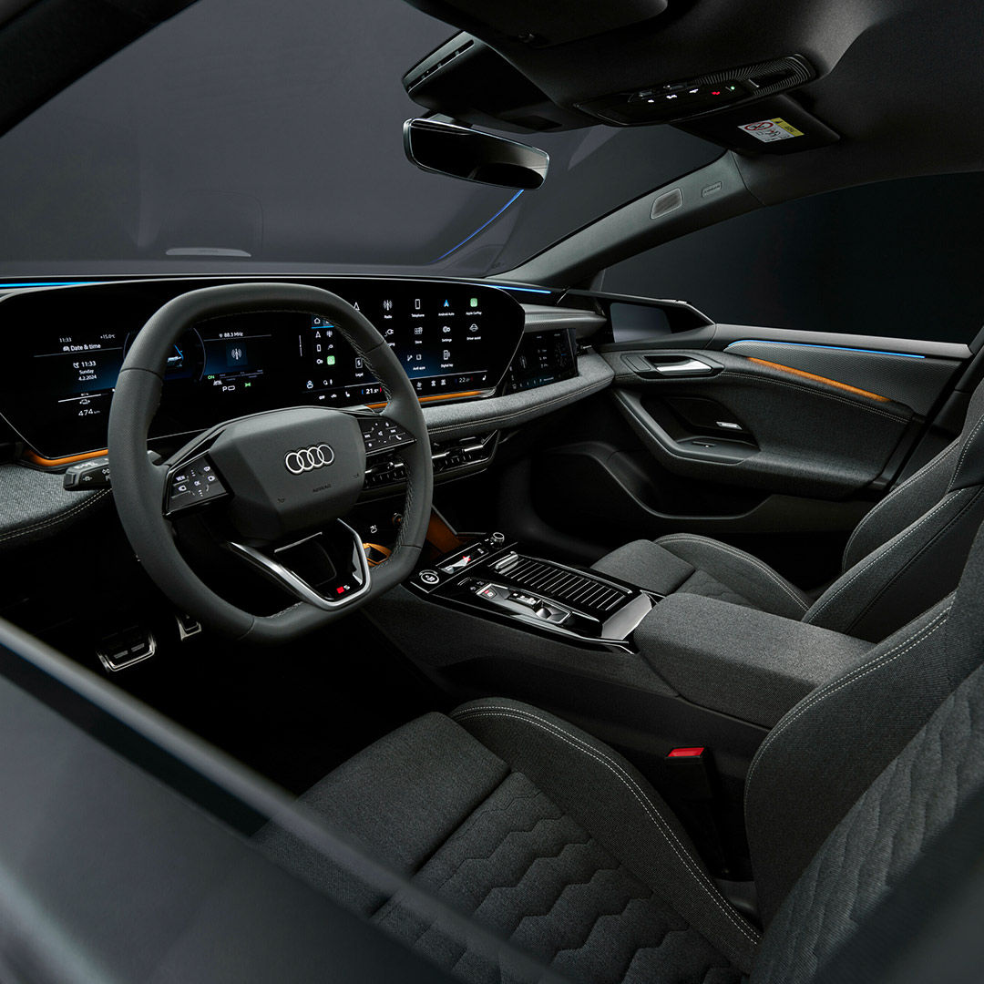La nueva filosofía de diseño de la marca define el interior. Dependiendo del nivel de equipamiento, el A6 Sportback e-tron ofrece muchas características innovadoras, como los retrovisores exteriores virtuales de segunda generación, un techo panorámico de cristal que se vuelve opaco con sólo pulsar un botón y el logotipo con los aros iluminados en la parte trasera.