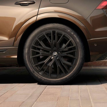 El paquete de acabado negro brillante, barras longitudinales en color negro en el techo y embellecedores de las ranuras de los cristales en negro brillante, confieren al Audi Q8 SUV TFSI e un aspecto deportivo. El acabado de pintura marrón tamarindo, metalizado y las carcasas de los retrovisores exteriores en negro brillante crean un aspecto exclusivo.